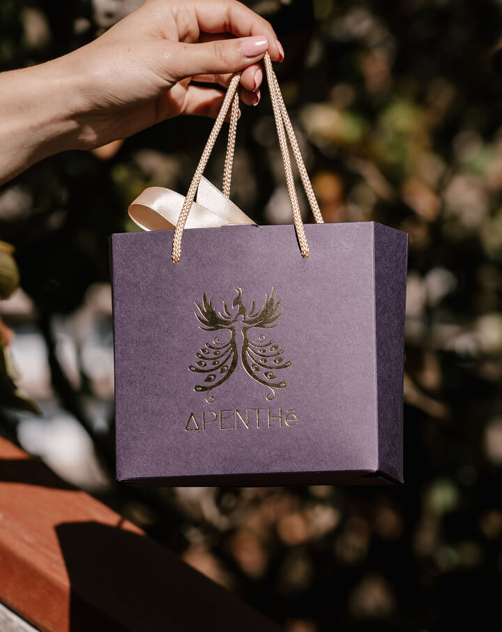 Your necklace will arrive in the mail in approximately 7 business days. It will come in a beautiful package that will be unmistakable. Inside you will find your sage wrapped in tissue paper along with your initiation ceremony card. Next you will find your necklace inside an hexagon shaped ΔPENTHē box and an ΔPENTHē pouch. On the back of the lid is an engraved reminder that "Everything comes from within".